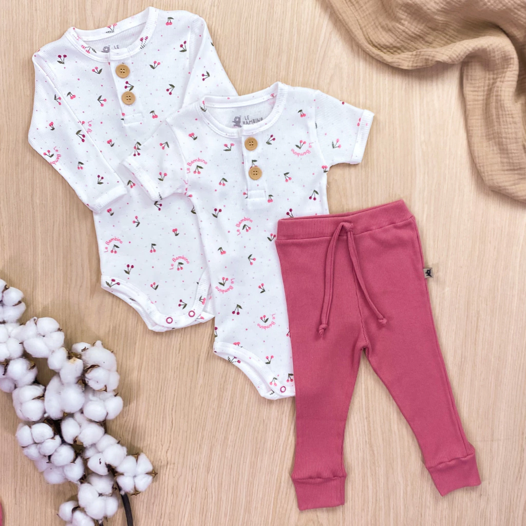Kit 3 peças Body Botão Manga Longa Cereja, Body Botão Manga Curta Cereja e Calça Bebê Canelada lisa Rosa Coral Comfort Premium