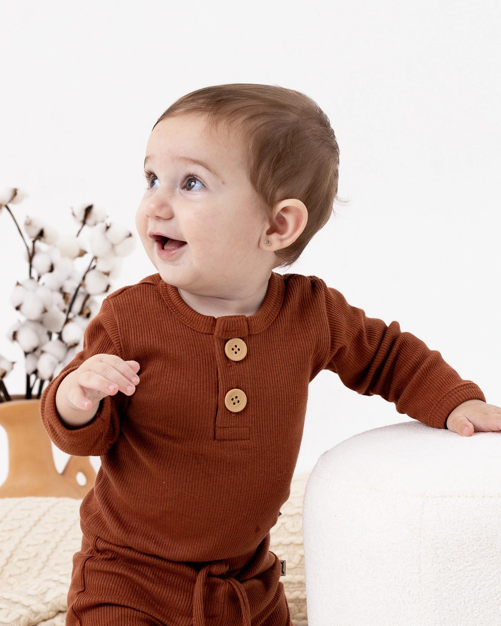 Seu design prático inclui uma gola envelope que facilita o vestir, além de dois botões entre as pernas, que tornam as trocas de fraldas mais rápidas e práticas. Com manga longa e tecido canelado, ele proporciona frescor e liberdade de movimento, ideal para qualquer estação.